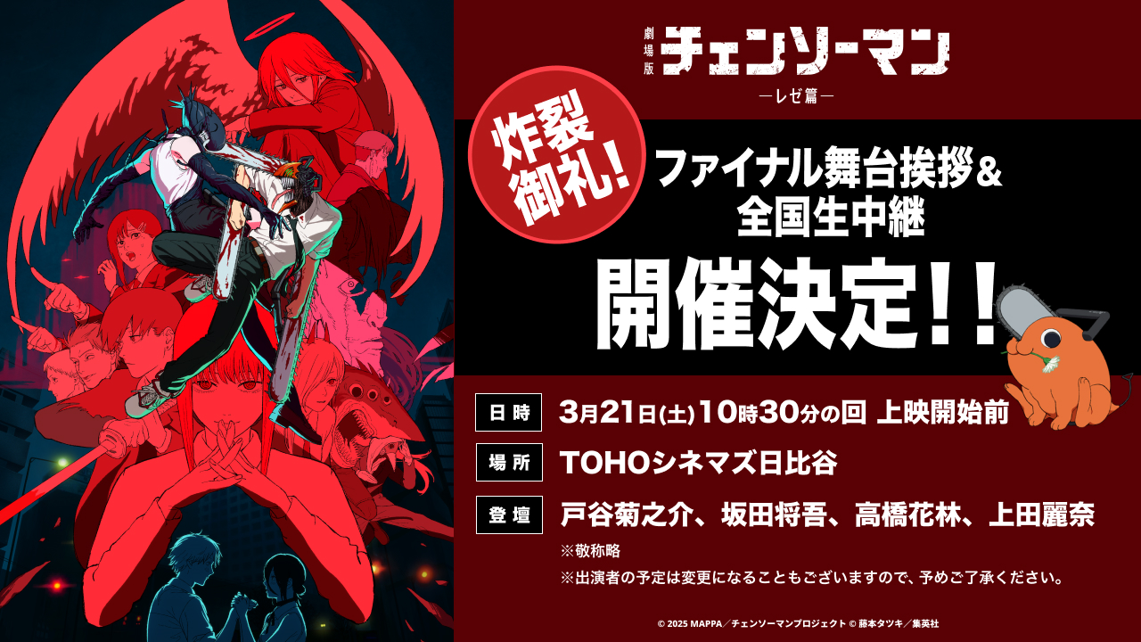 TOHOシネマズ日比谷で行われる、劇場版『チェンソーマン レゼ篇』炸裂御礼!ファイナル舞台挨拶&全国同時生中継を当劇場で開催します。
